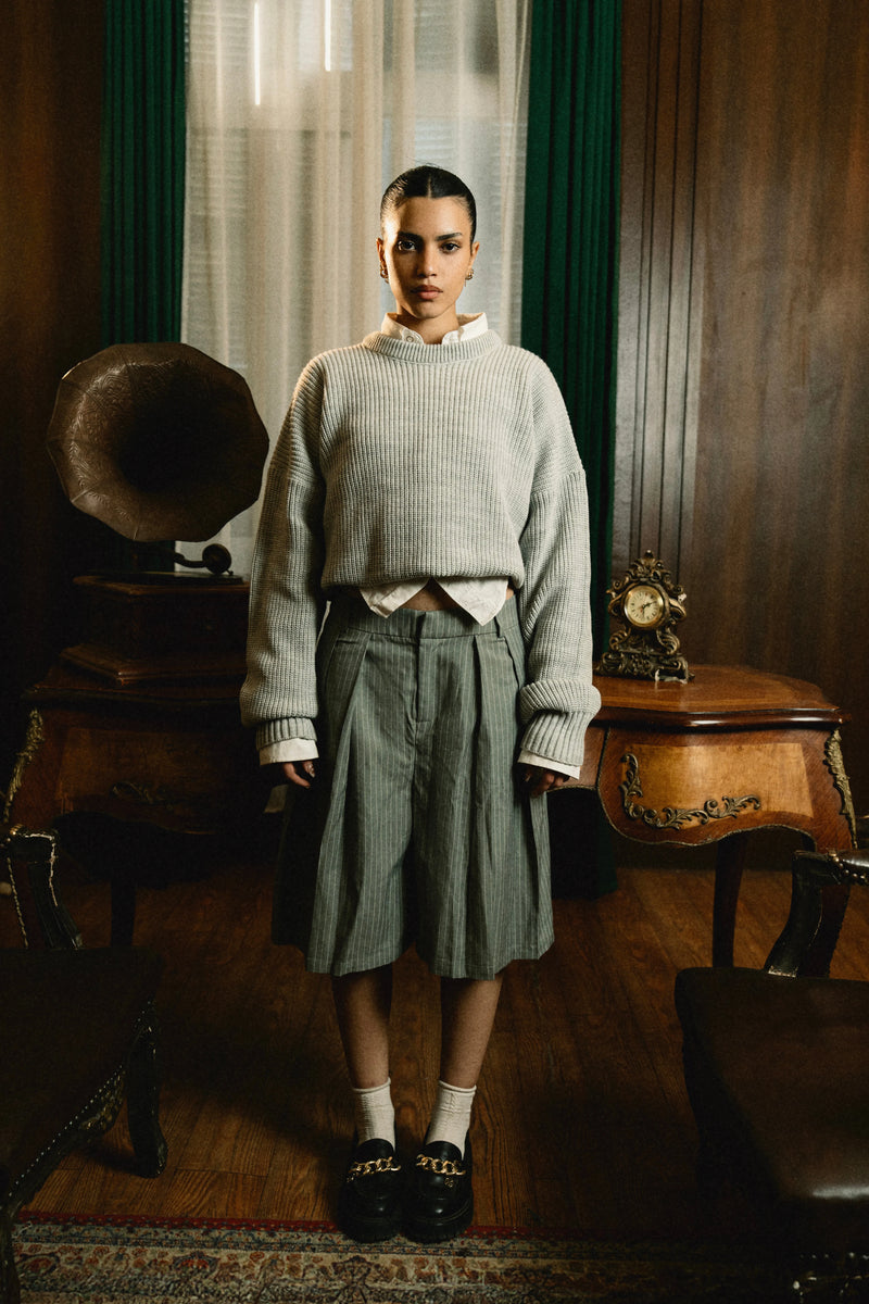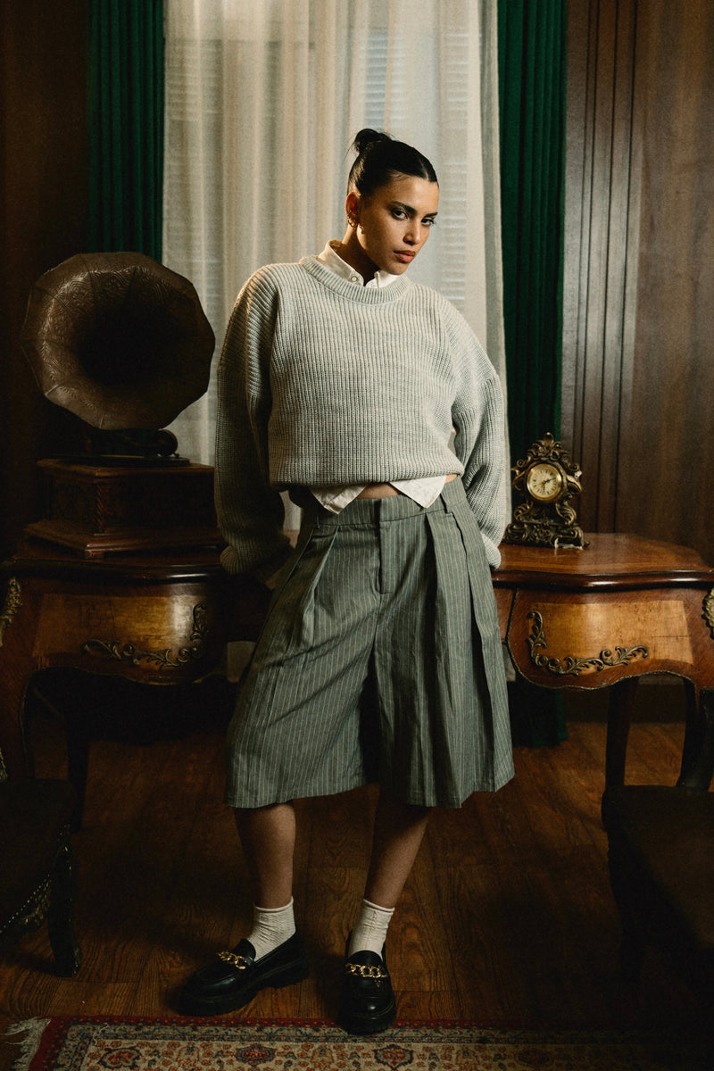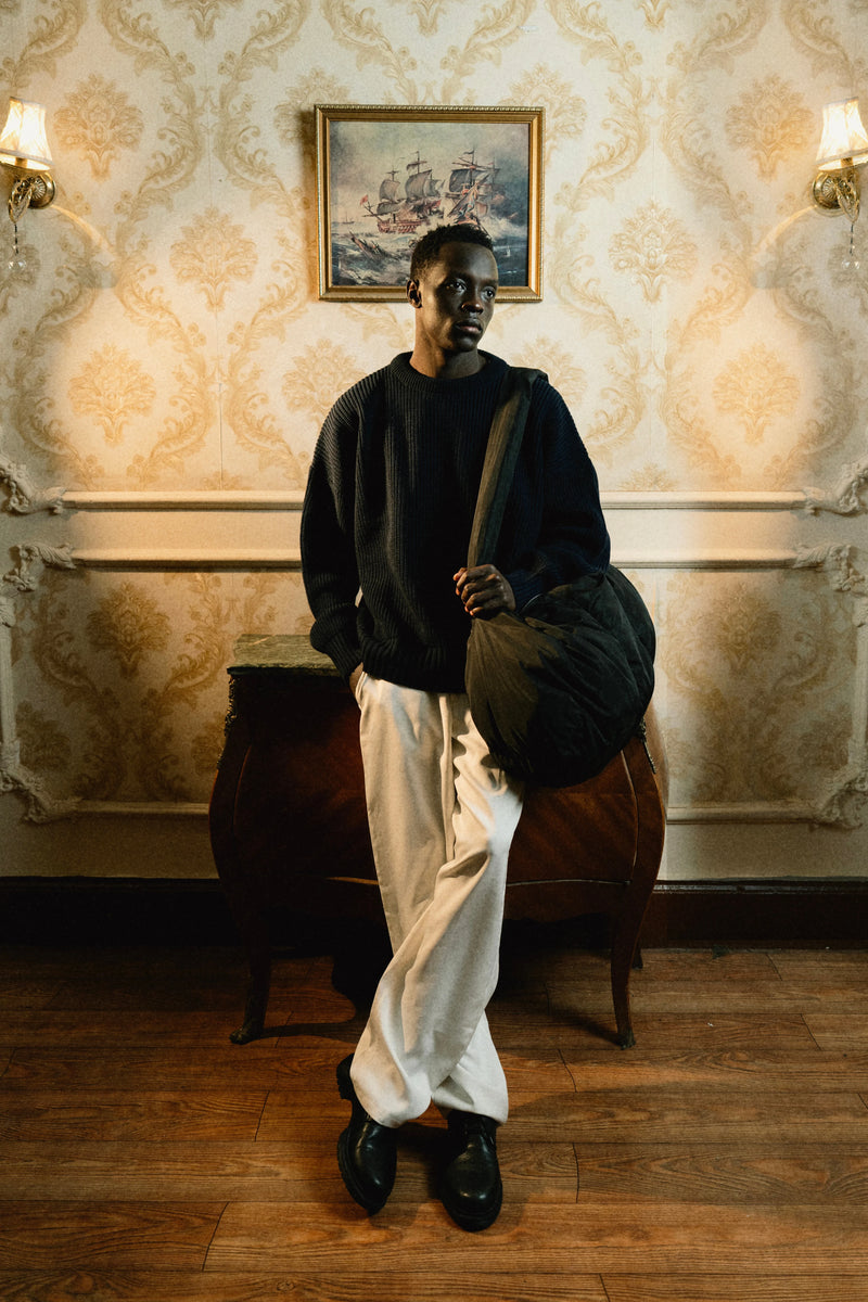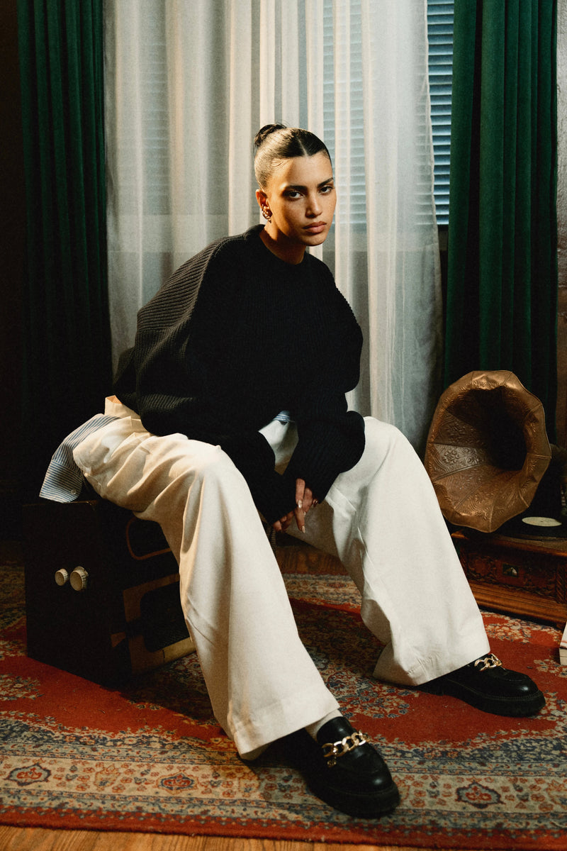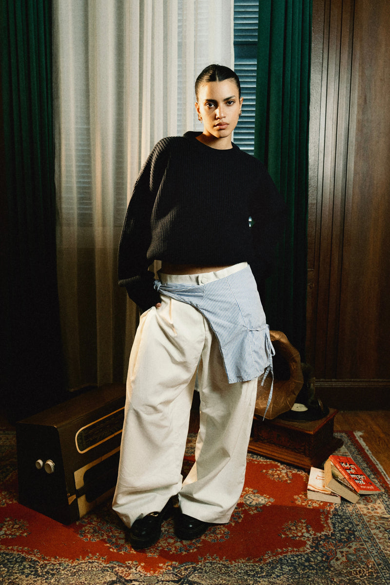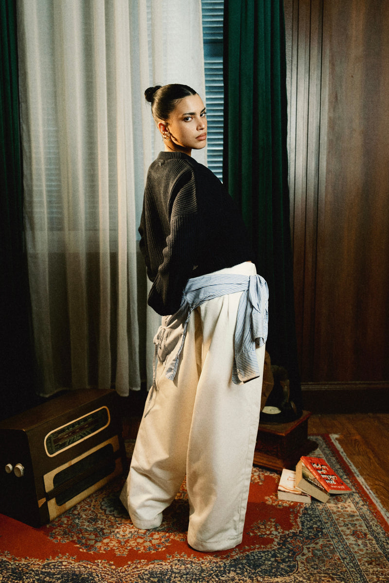 Premium yarns, Boxy fit, structured trousers.